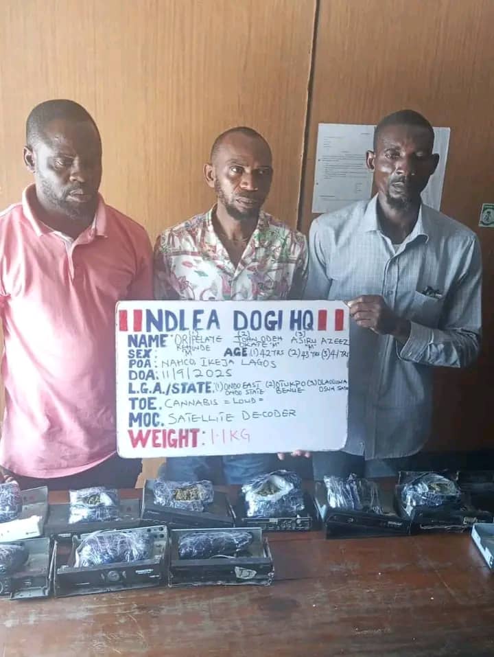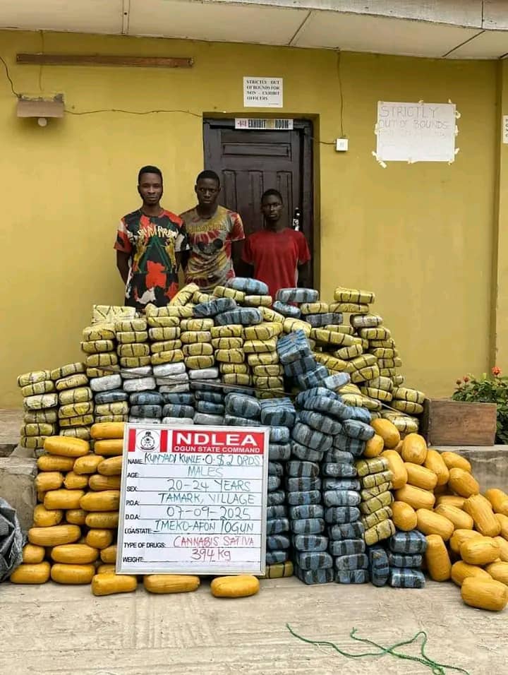 In Yobe, a suspect Mohammed Auwal was arrested after 36 blocks of cannabis sativa weighing 22.1kg were recovered from his residence at Gadan Talakawa area of Potiskum, while three trans-border drug traffickers: Kunyadi Kunle Ogbungbun, 24; Olalekan Adewale, 20; and Sanya Joshua,22, were nabbed with 394kg skunk at Imeko area of Ogun State during a joint operation by NDLEA operatives with the police and local vigilante on Sunday 7th September. Three motorcycles used in conveying the illicit consignment were also recovered.