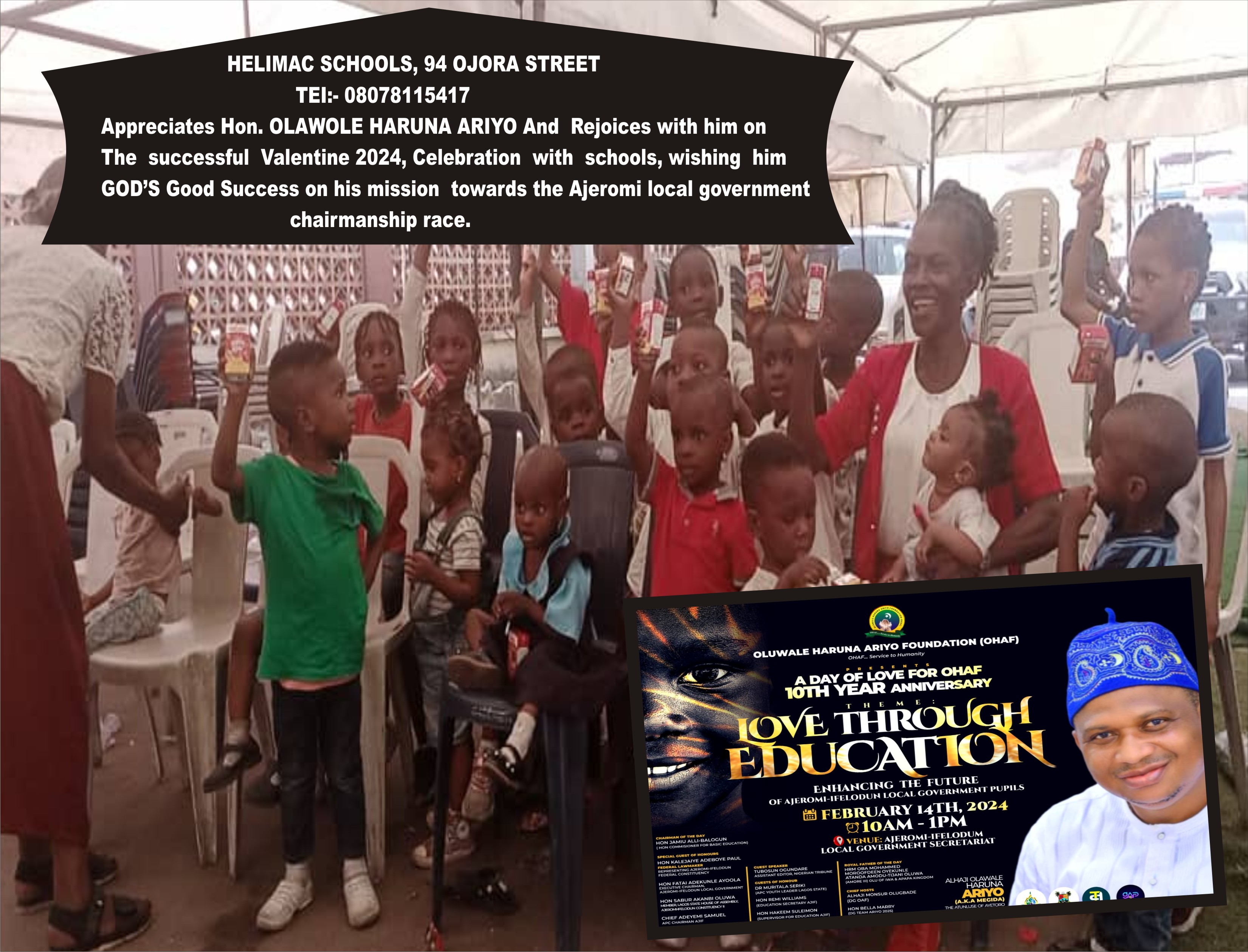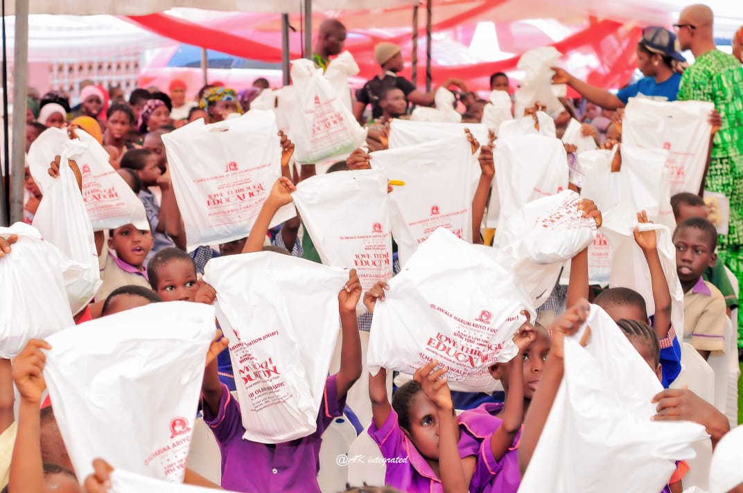 Philanthropist Alhaji Olawale Haruna Ariyo has put smiles on the faces of 200 lucky pupils from the 48 Primary schools in Ajeromi Local Government Area. The pupils benefitted from the generosity of Olawale Haruna Ariyo Foundation as part of the Valentine Day celebration which took place on February 14th,, 2024.